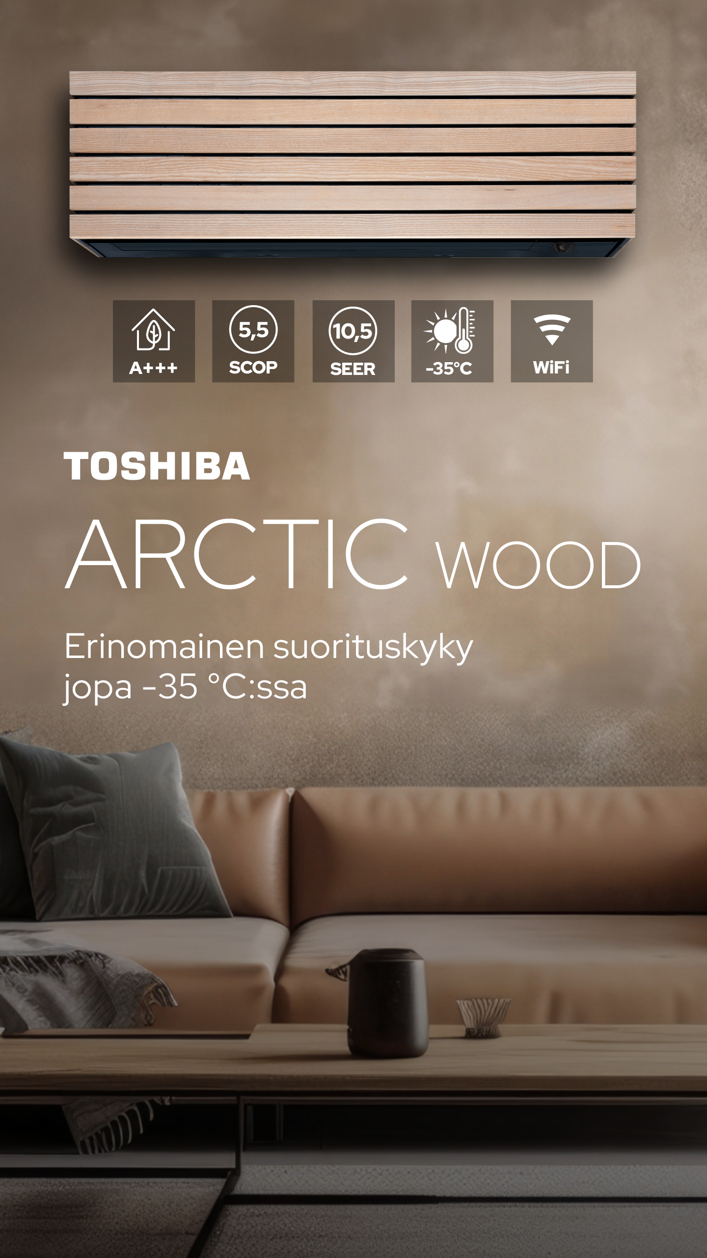 Toshiba Arctic on energiatehokas ja hiljainen ilmalämpöpumppu omakotitaloon, mökille tai vapaa-ajan asuntoon, kun haluat varman lämmityksen, tehokkaan viilennyksen ja tyylikkään sisäyksikön pohjoisen ankariin sääolosuhteisiin.